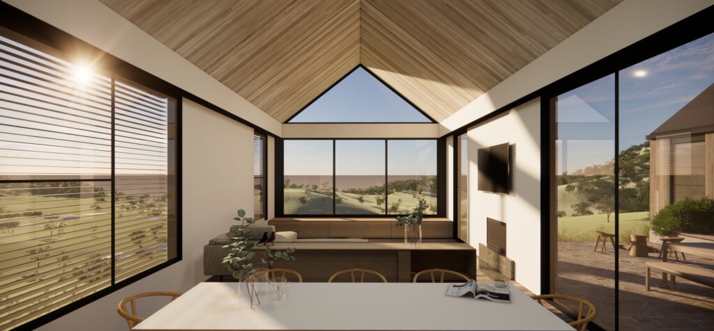 Pacific teak timber – external cladding and internal wall finish, Scyon Axon cladding – internal wall and ceiling, Colorbond Diversaclad cladding (Monument), Black powder-coated frame and thermally broken, low-e double-glazed windows, Signorino Metropolis tiles (London Grey), Plank Flooring (Rawma), Black Madinoz door hardware, Matt black and American oak veneer kitchen joinery, Caesarstone kitchen island (Rugged Concrete) with integrated solid American oak dining table, Miele appliances, Franke sink with Astra Walker mixer, Methven tapware to bathrooms (matt black), Daikin bulkhead reverse-cycle and split systems, Tesla Power Wall, Heatmaster gas fireplace with custom fascia