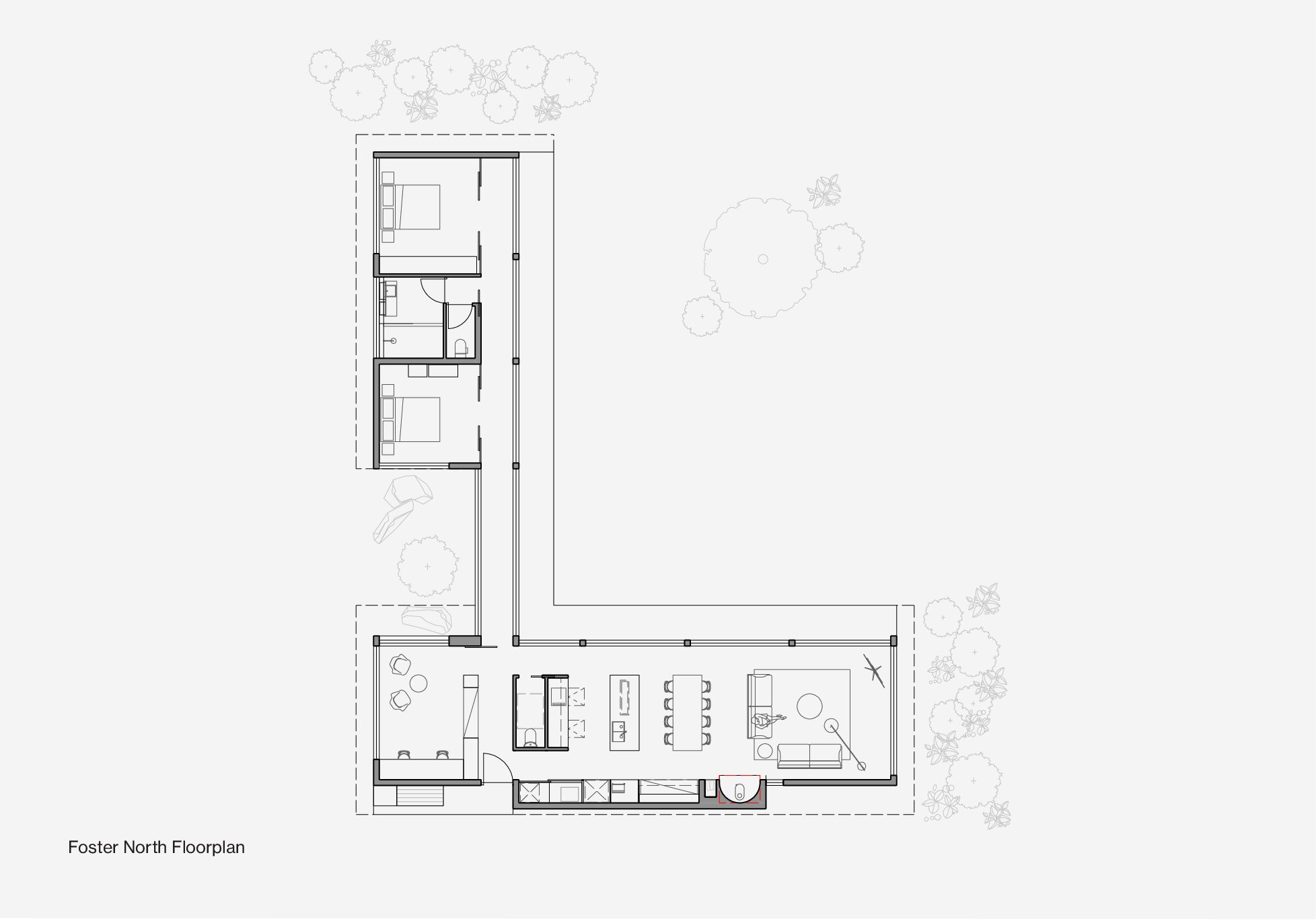 At its heart, the home consists of two open pavilions arranged in an L-shaped formation. These are anchored by a central courtyard garden that creates a calm and meditative focal point—blurring the boundaries between indoor and outdoor. The living pavilion opens up to sweeping views through a generous picture window, while the sleeping pavilion offers a more intimate retreat with direct access to the landscape.