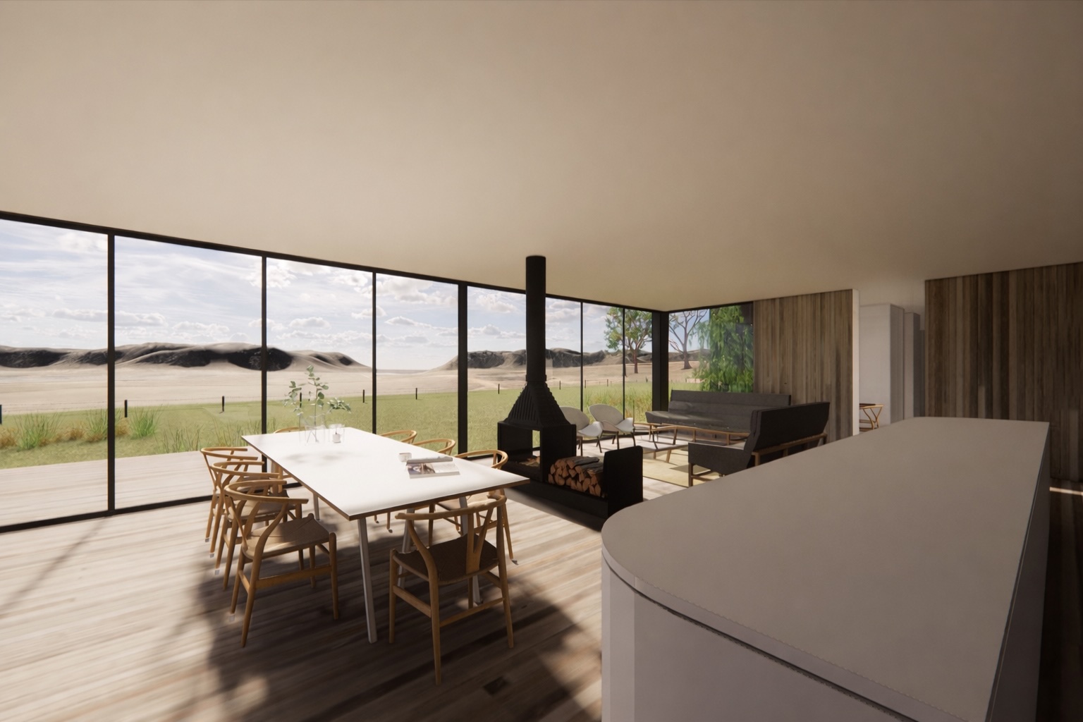 The result is a contemporary country holiday home designed for shared experiences, where weekends are spent outdoors, fires burn late into the evening, and time with family and friends becomes the focus.