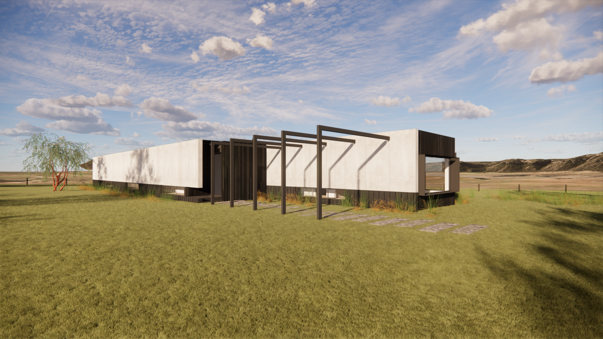 Externally, the home combines metal and timber cladding with timber battens, creating a material palette that sits comfortably within that sits quietly in the landscape. To the rear, a façade of concrete look sheeting offers protection from the harsh western sun. The layered façade adds texture and depth while reinforcing the home’s connection to its natural setting.