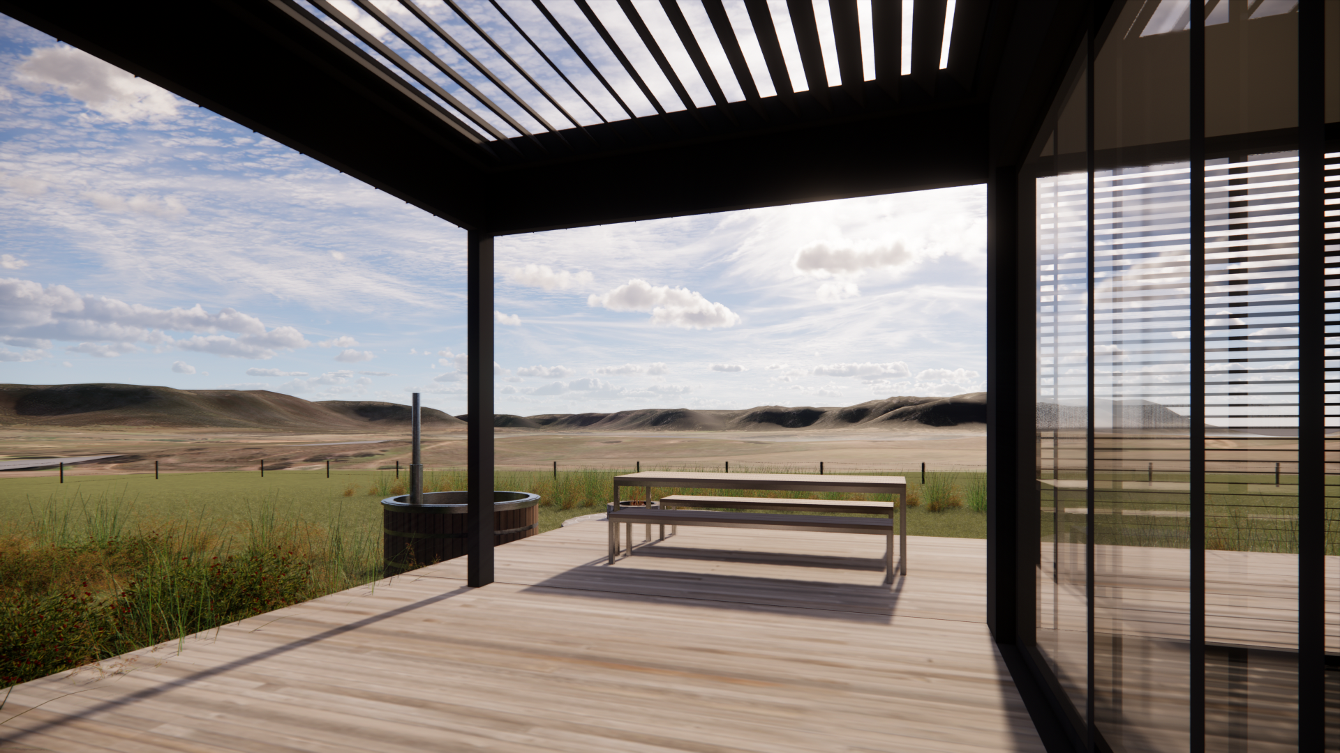 Large windows frame expansive views across the landscape from multiple aspects, allowing the changing light, weather and seasons to become part of everyday life inside the home. The design places strong emphasis on indoor and outdoor living, with spaces that flow naturally toward terraces and outdoor areas.
