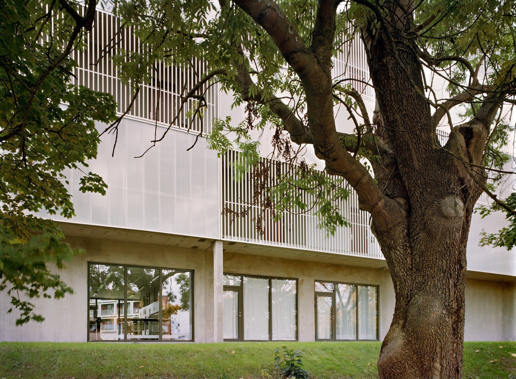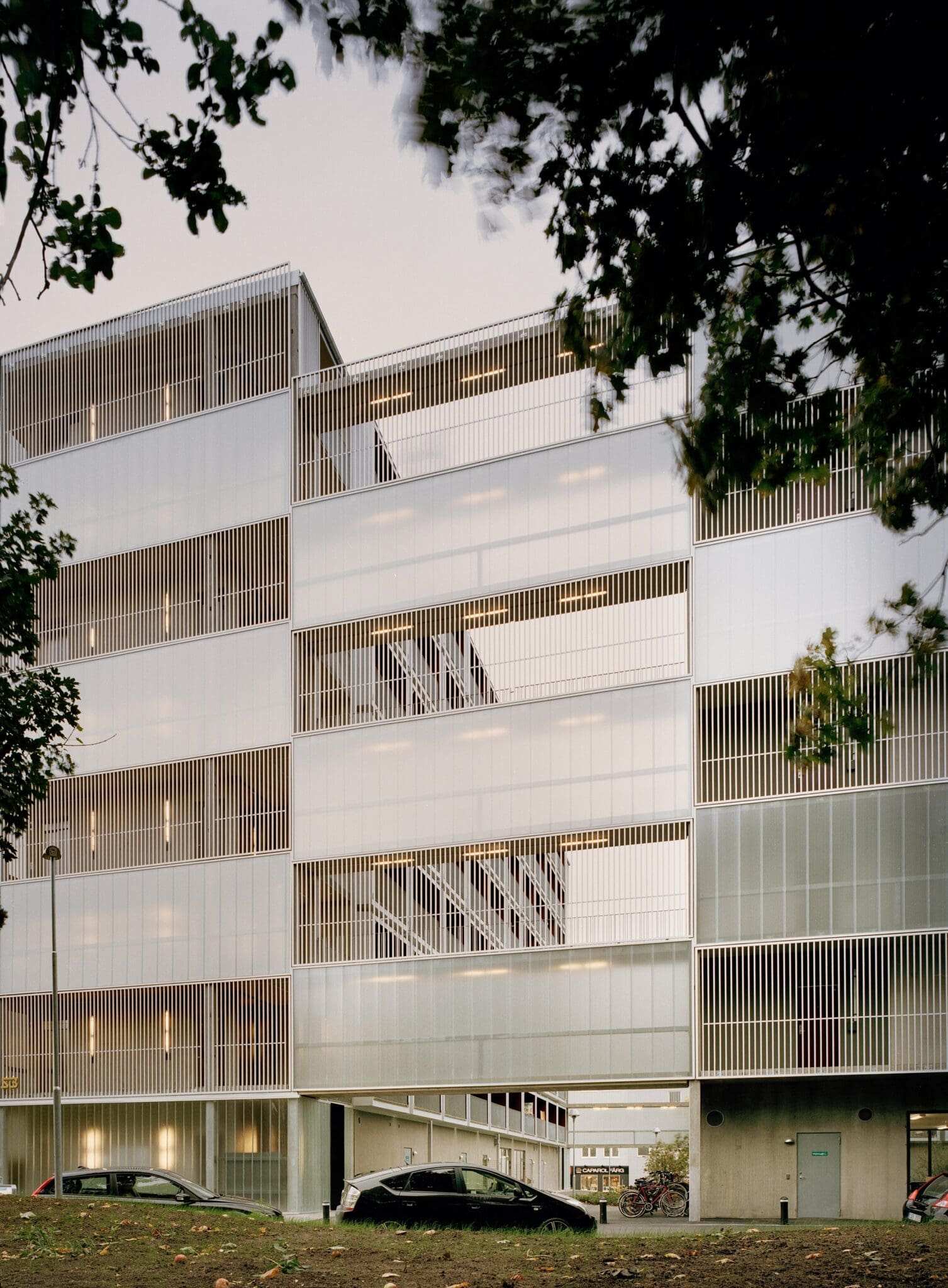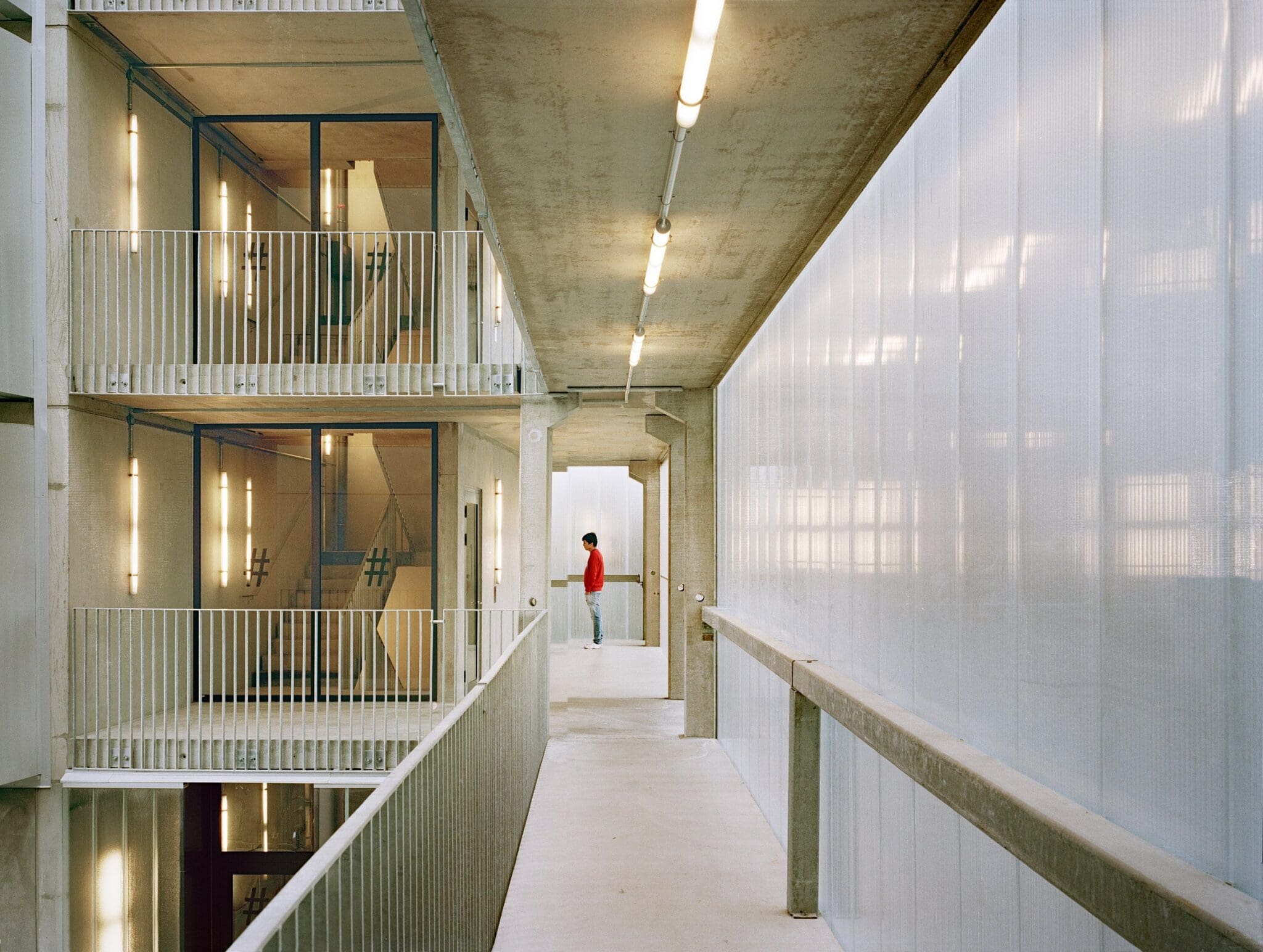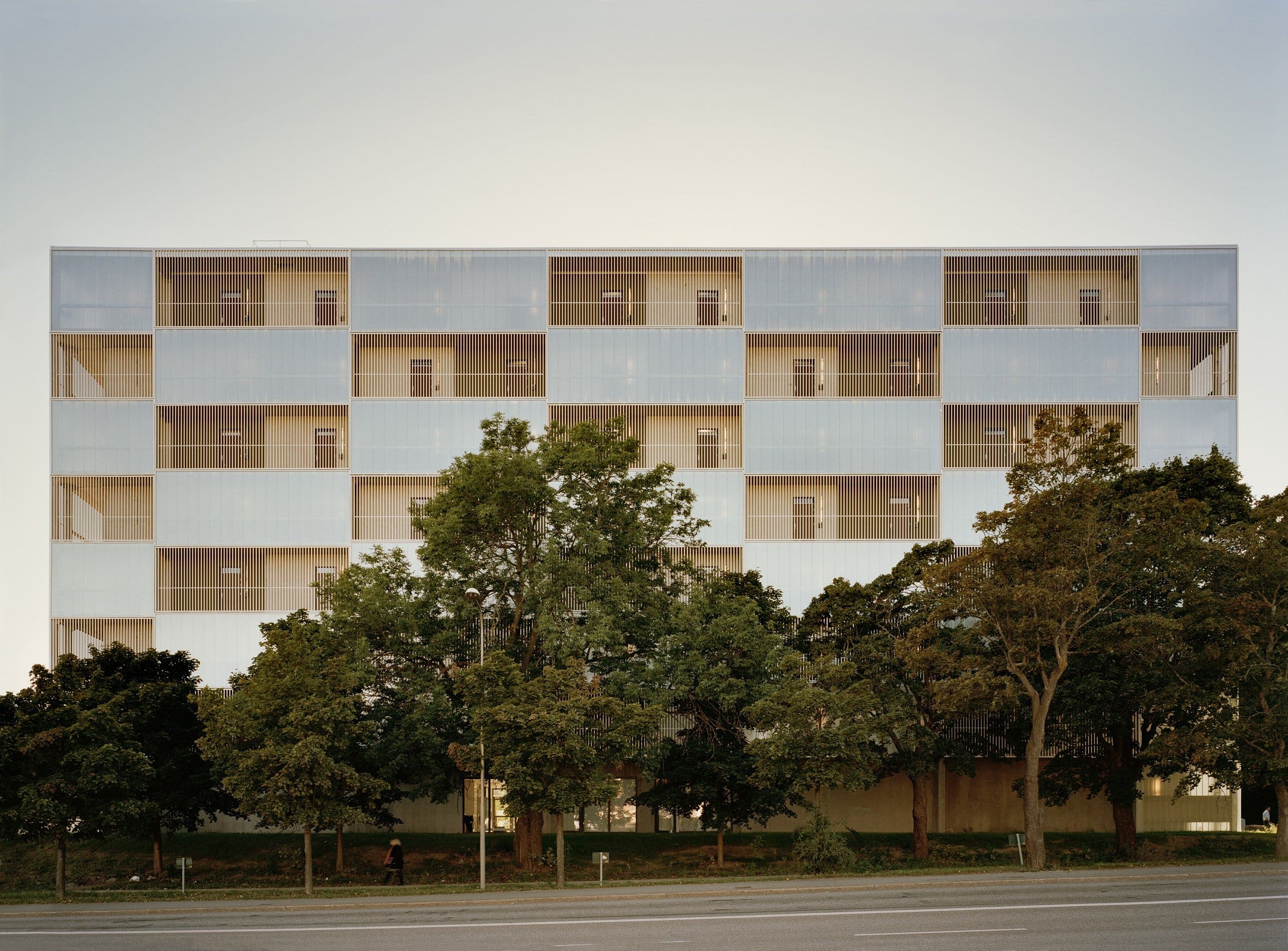 Generous balconies, shared ground-floor facilities, and transparent glass entrances strengthen the relationship between residents and their neighbourhood. The façades feature a rhythmic pattern of translucent polycarbonate panels and vertical aluminium louvres—a distinctive design that reflects the project’s modular construction while capturing the light and texture of its industrial surroundings.